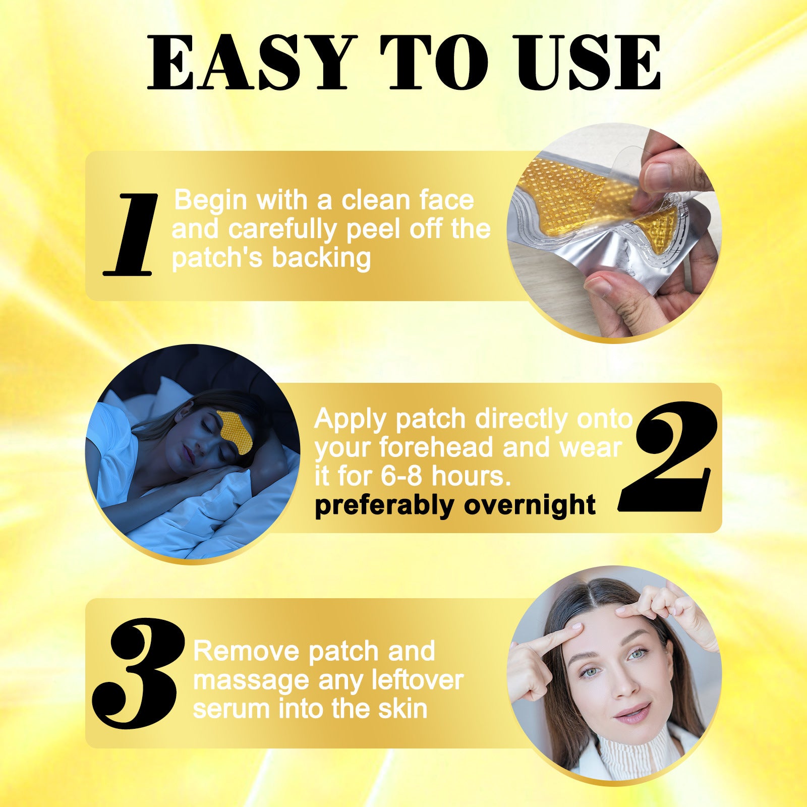 Easy to Use: Begin with a clean face and carefully peel off the patch's backing, Apply patch directly onto your forehead and wear it for 30-60 minutes.. Remove patch and massage any leftover serum into the skin.