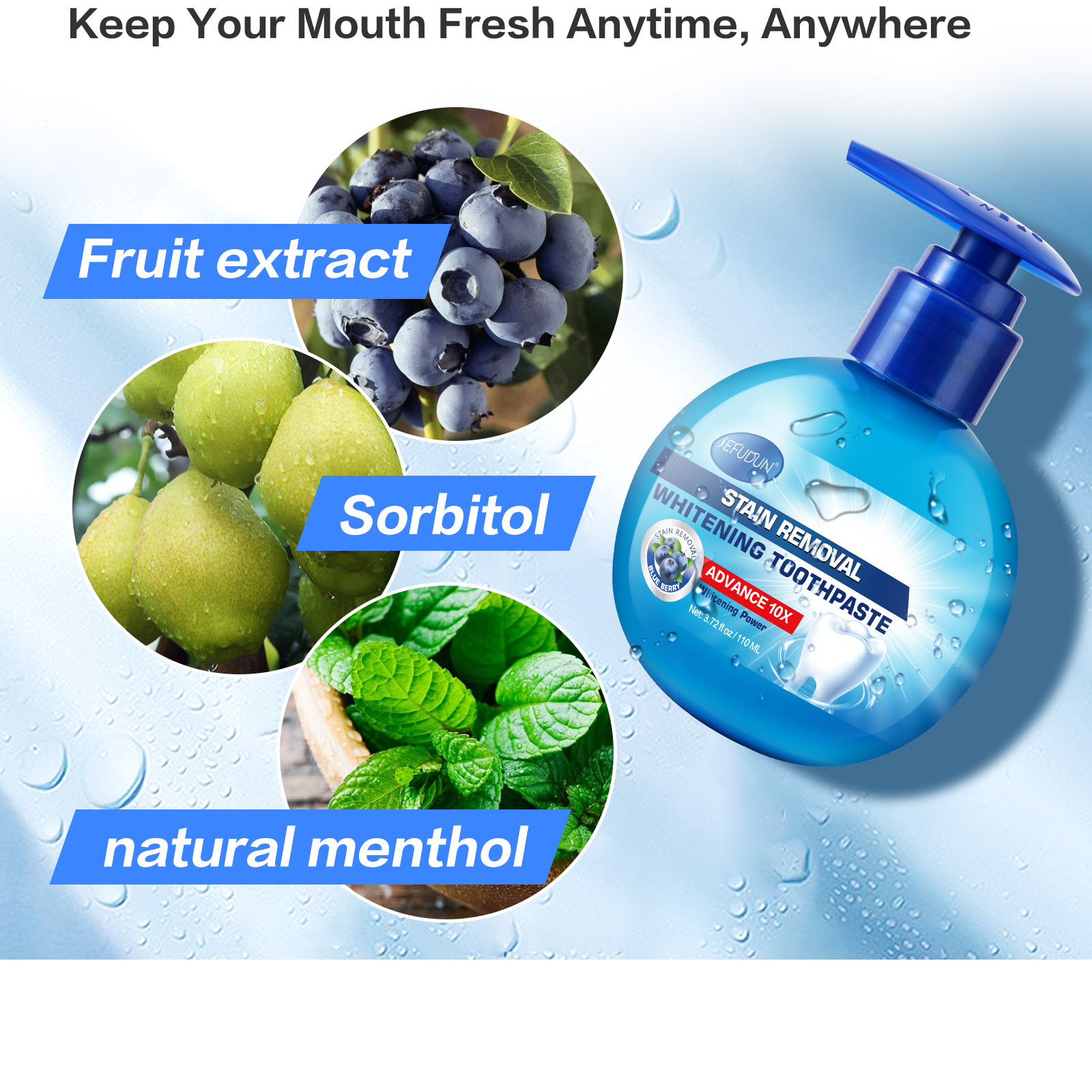 Baking Soda - Sefudun Intensive Stain Removal Toothpaste is the most effective natural stain remover by making use of the strong cleaning power of baking soda. Strong baking soda penetrates crevices in teeth enamel deeply to remove stubborn tea, coffee or nicotine stains.